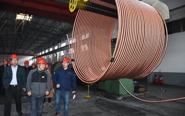 參觀團(tuán)在生產(chǎn)經(jīng)理帶領(lǐng)下來到銅業(yè)公司生產(chǎn)車間,詳細(xì)聽取和了解宏泰連鑄連軋自動化銅管生產(chǎn)工藝,針對生產(chǎn)管理提出了寶貴的建議和意見。